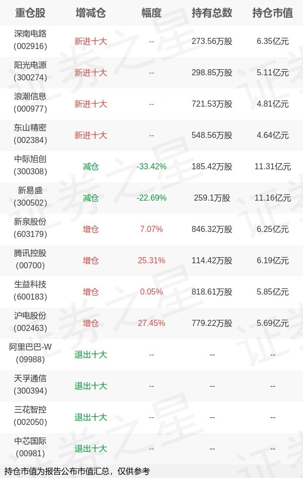 证券之星消息,1月17日中欧基金旗下冯炉丹管理的中欧数字经济混合型发起式基金公布年报,近1年净值增长率157.88%。与上一季度相比,该基金前十大重仓股新增深南电路,阳光电源,浪潮信息,东山精密;其中中际旭创持仓占比9.89%,为该基金第一大重仓股;阿里巴巴-W,天孚通信,三花智控,中芯国际等退出前十大重仓股;详细数据如下: