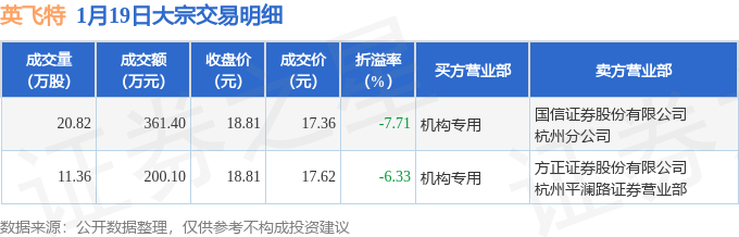 证券之星消息,1月19日英飞特发生大宗交易,交易数据如下: