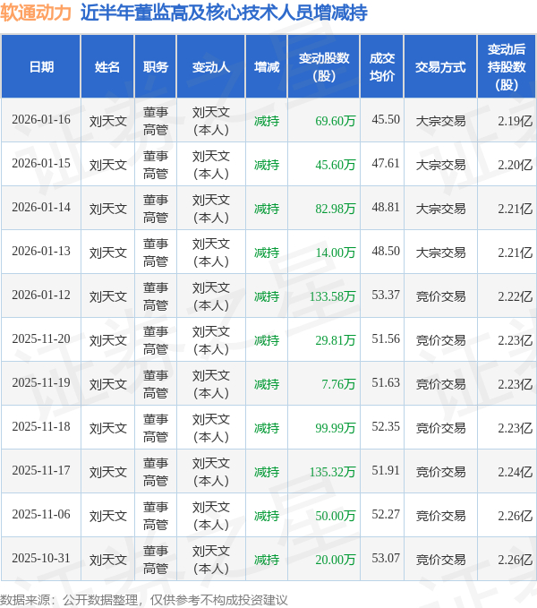 证券之星消息,根据1月19日市场公开信息、上市公司公告及交易所披露数据整理,软通动力(301236)最新董监高及相关人员股份变动情况:2026年1月16日公司董事,高管刘天文共减持公司股份69.6万股,占公司总股本为0.073%。变动期间公司股价下跌2.63%,1月16日当日收盘报51.51元。