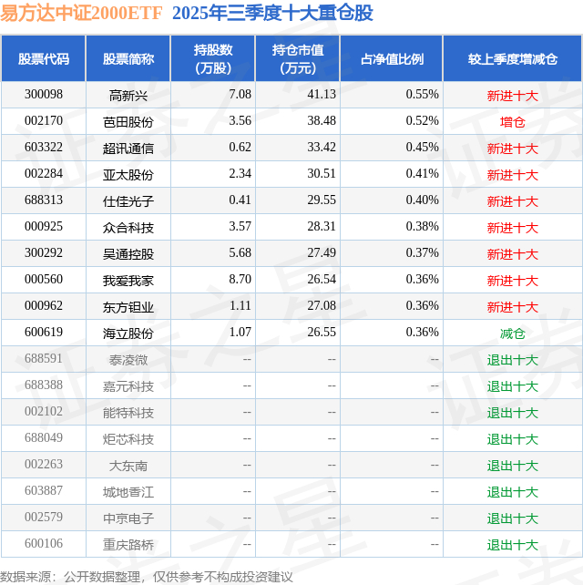 易方达中证2000ETF的前十大重仓股如下: