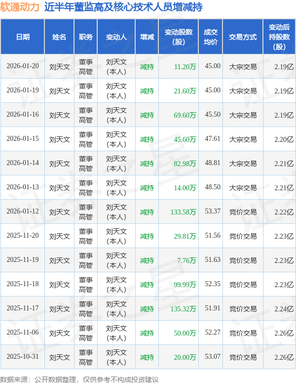 证券之星消息,根据1月21日市场公开信息、上市公司公告及交易所披露数据整理,软通动力(301236)最新董监高及相关人员股份变动情况:2026年1月20日公司董事,高管刘天文共减持公司股份11.2万股,占公司总股本为0.0118%。变动期间公司股价下跌1.67%,1月20日当日收盘报50.16元。
