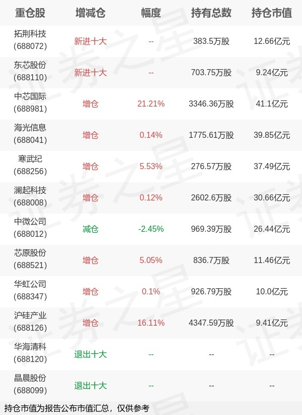 证券之星消息,1月22日嘉实基金旗下田光远管理的嘉实上证科创板芯片交易型开放式指数基金公布年报,近1年净值增长率88.46%。与上一季度相比,该基金前十大重仓股新增拓荆科技,东芯股份;并对中芯国际增仓585.46万股,为该基金第一大重仓股;华海清科,晶晨股份等退出前十大重仓股;详细数据如下: