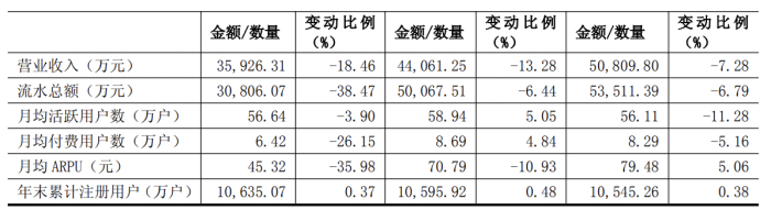从公司披露的数据来看,近年来(2022年-2024年),公司累计注册用户数增长停滞,始终维持在1.1亿户。同时,游戏收入、月均付费用户数以及月均ARPU三项关键指标连续三年同步下滑:收入由2022年的5.08亿元降至2024年的3.59亿元;月均付费用户数由8.29万户降至6.42万户;月均ARPU由79.48元下滑至45.32元。
