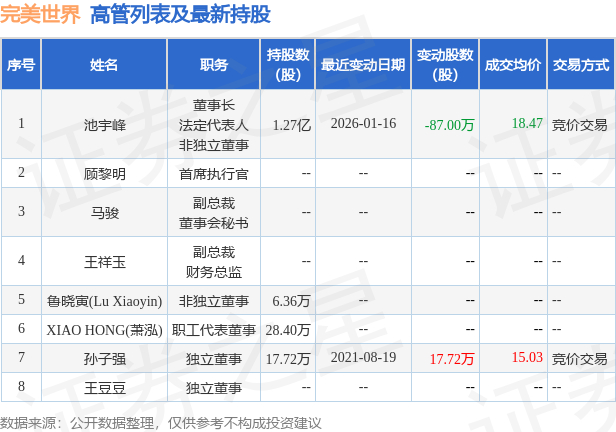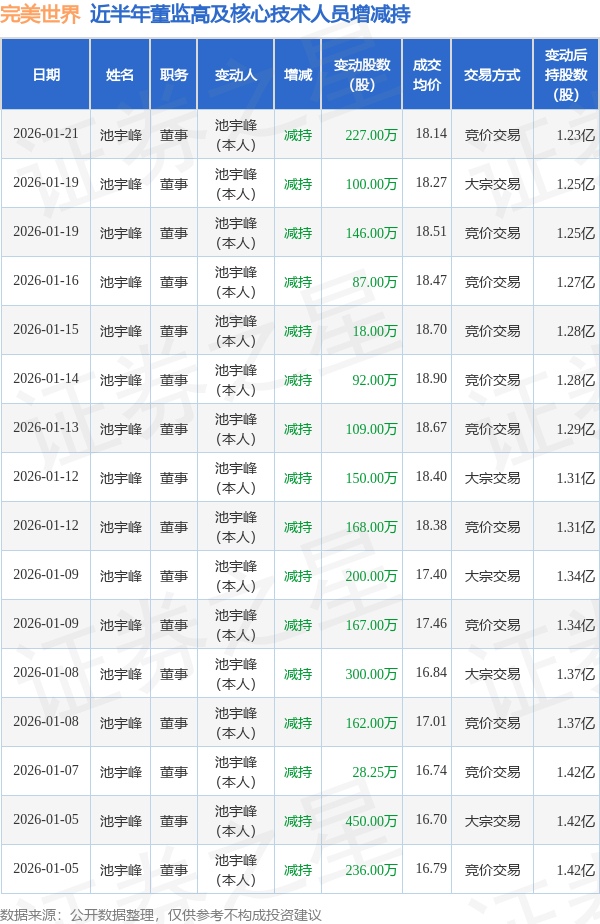 完美世界近半年内的董监高及核心技术人员增减持详情如下: