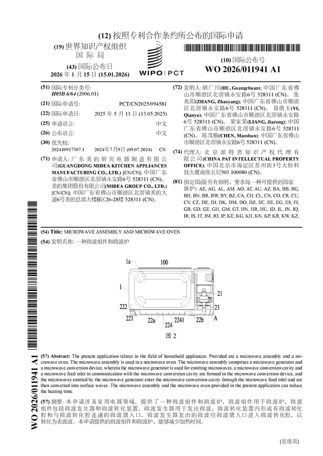 证券之星消息,根据企查查数据显示美的集团(000333)公布了一项国际专利申请,专利名为“一种微波组件和微波炉”,专利申请号为PCT/CN2025/094581,国际公布日为2026年1月15日。