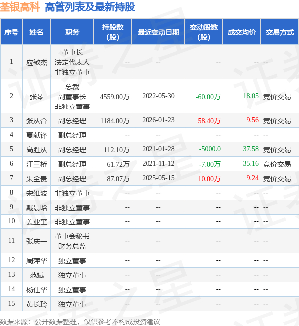荃银高科的高管列表及最新持股情况如下:
