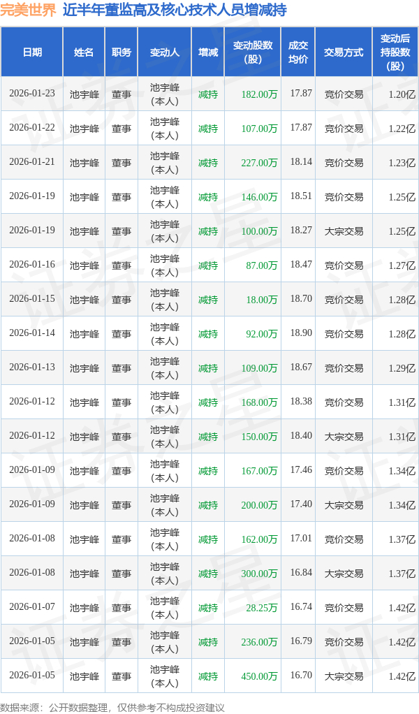 完美世界近半年内的董监高及核心技术人员增减持详情如下: