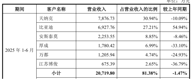 其中,天纳克各期均为第一大客户,其营收贡献分别为1.11亿元、1.49亿元、1.79亿元、7876.73万元,营收占比分别为26.69%、29.37%、31.57%、30.94%。不过2025年上半年,来自天纳克的营收同比下降了10.09%。根据第二轮问询,天纳克理想、奔驰系列2025年上半年收入同比分别下降776.18万元和169.91万元。