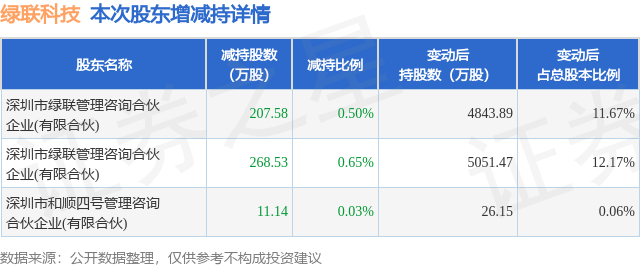 证券之星消息,1月28日绿联科技发布公告《绿联科技:关于持股5%以上股东及其一致行动人减持股份触及1%整数倍暨减持计划实施完成的公告》,其股东深圳市绿联管理咨询合伙企业(有限合伙)、深圳市和顺四号管理咨询合伙企业(有限合伙)于2025年11月11日至2026年1月27日间合计减持487.25万股,占公司目前总股本的1.1743%,变动期间该股股价上涨7.59%,截止1月27日收盘报70.0元。