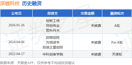 证券之星消息,根据天眼查APP于1月26日公布的信息整理,派镀科技(深圳)有限公司A轮融资,融资额未披露,参与投资的机构包括创新工场,同创伟业,君科丹木。