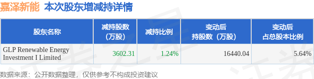 证券之星消息,2月1日嘉泽新能发布公告《嘉泽新能:嘉泽新能源股份有限公司持股5%以上股东权益变动触及1%刻度暨减持股份实施结果公告》,其股东GLP Renewable Energy Investment I Limited于2026年1月28日至2026年1月30日间合计减持3602.31万股,占公司目前总股本的1.2367%,变动期间该股股价下跌2.53%,截止1月30日收盘报5.77元。