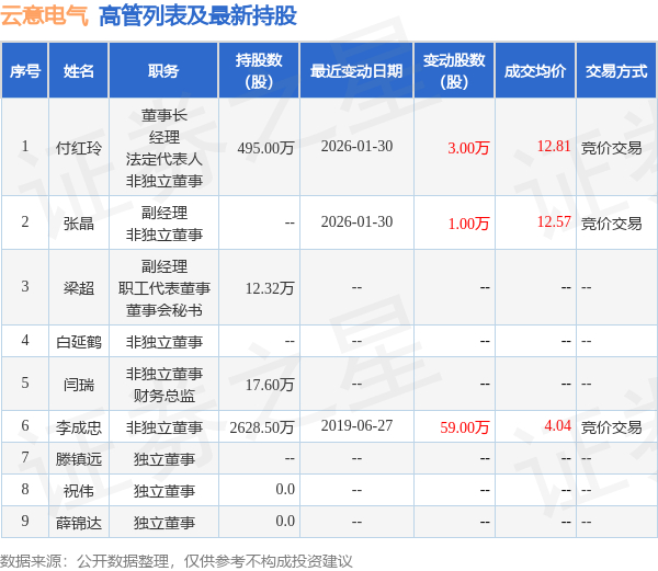 证券之星消息,根据2月6日市场公开信息、上市公司公告及交易所披露数据整理,云意电气(300304)最新董监高及相关人员股份变动情况:2026年2月5日公司董事,高管付红玲、董事,高管张晶共增持公司股份11.0万股,占公司总股本为0.0125%。变动期间公司股价下跌1.98%,2月5日当日收盘报12.9元。