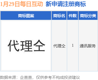 证券之星消息,根据天眼查APP数据显示,近日每日互动股份有限公司新提交“代理仝”商标注册申请。商标申请详情如下:
