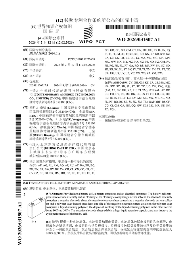 证券之星消息,根据企查查数据显示宁德时代(300750)公布了一项国际专利申请,专利名为“电池单体、电池装置和用电装置”,专利申请号为PCT/CN2025/077638,国际公布日为2026年2月12日。
