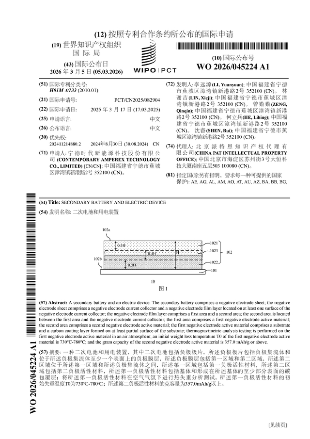 证券之星消息,根据企查查数据显示宁德时代(300750)公布了一项国际专利申请,专利名为“二次电池和用电装置”,专利申请号为PCT/CN2025/082904,国际公布日为2026年3月5日。