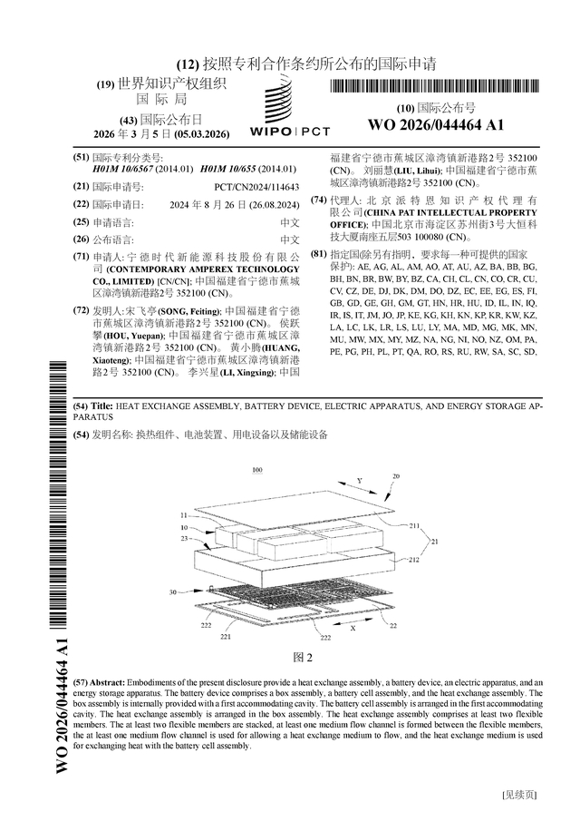 证券之星消息,根据企查查数据显示宁德时代(300750)公布了一项国际专利申请,专利名为“换热组件、电池装置、用电设备以及储能设备”,专利申请号为PCT/CN2024/114643,国际公布日为2026年3月5日。