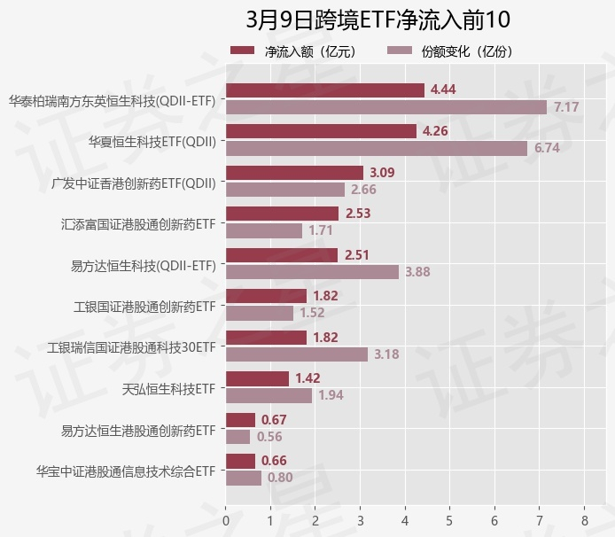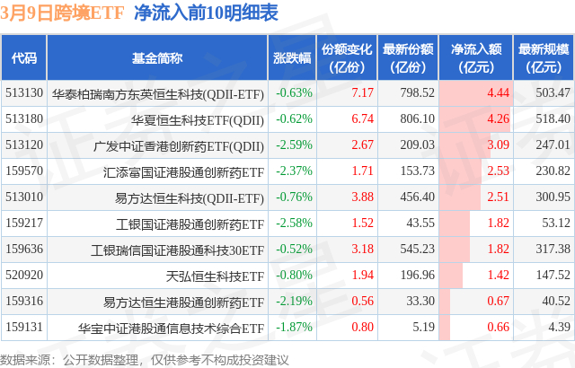 当日有119只跨境ETF基金出现资金净流入,其中净流入排首位的是华泰柏瑞南方东英恒生科技(QDII-ETF)(513130),份额增加了7.17亿份,净流入额为4.44亿元。