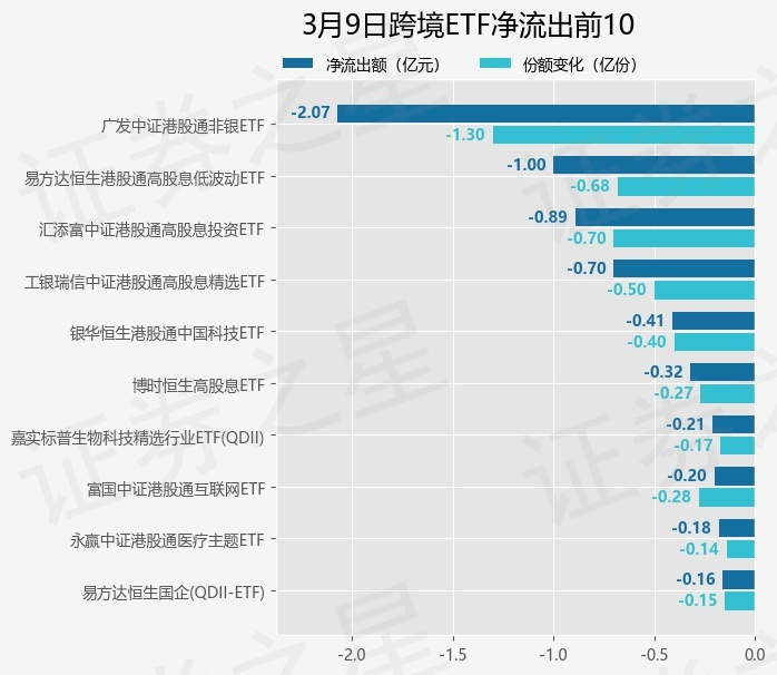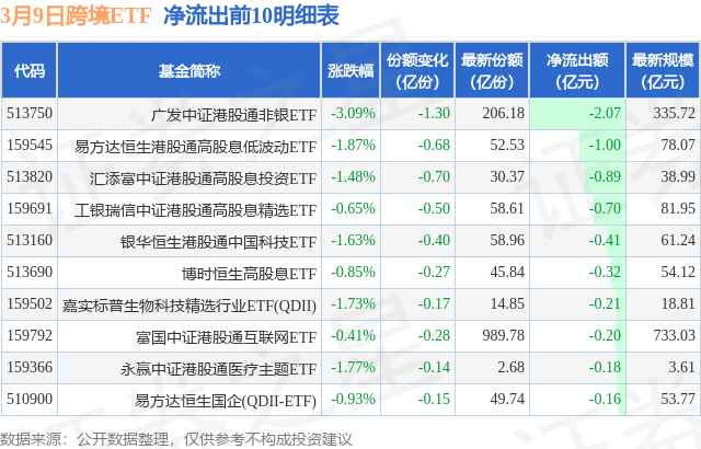 当日有25只跨境ETF基金出现资金净流出,其中净流出排首位的是广发中证港股通非银ETF(513750),份额减少了1.3亿份,净流出额为2.07亿元。