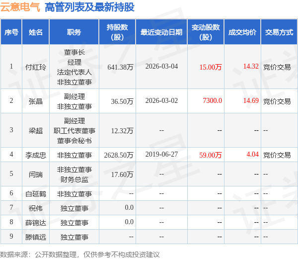 证券之星消息,根据3月10日市场公开信息、上市公司公告及交易所披露数据整理,云意电气(300304)最新董监高及相关人员股份变动情况:2026年3月9日公司董事,高管付红玲共增持公司股份6.0万股,占公司总股本为0.0068%。变动期间公司股价下跌3.16%,3月9日当日收盘报14.71元。