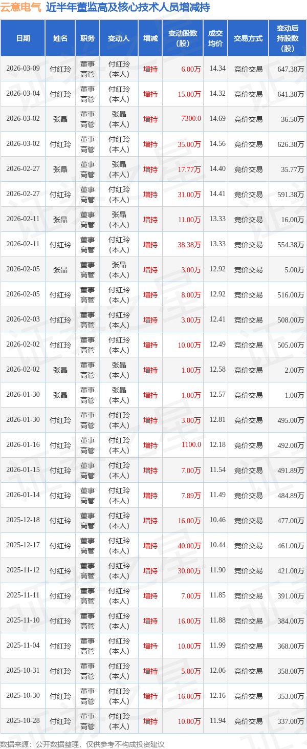 云意电气近半年内的董监高及核心技术人员增减持详情如下: