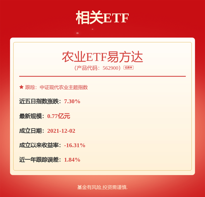 中证现代农业主题指数覆盖生猪养殖、肉鸡养殖、种植、饲料等农业核心赛道,其中生猪养殖占比约43%。农业ETF易方达(562900)跟踪该指数,产品管理费率仅为0.15%/年,是把握本轮农业周期反转的高效工具。