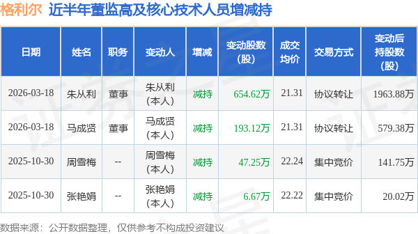 格利尔近半年内的董监高及核心技术人员增减持详情如下: