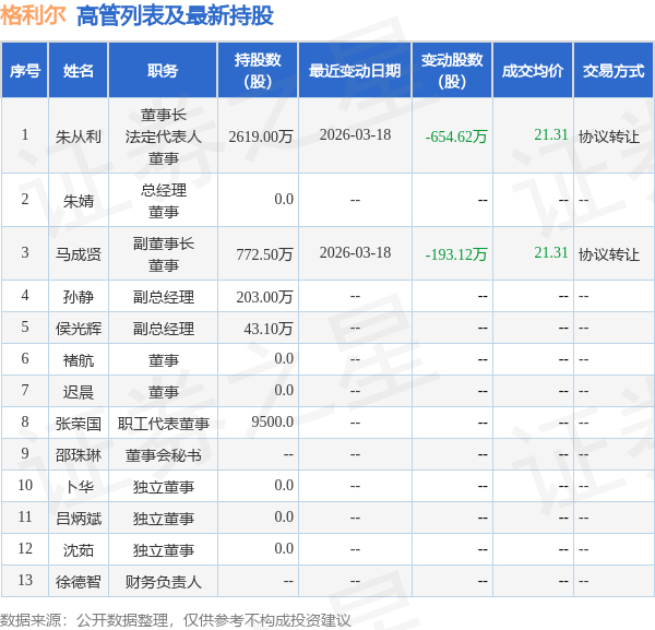 证券之星消息,根据3月21日市场公开信息、上市公司公告及交易所披露数据整理,格利尔(920641)最新董监高及相关人员股份变动情况:2026年3月18日公司董事朱从利、董事马成贤共减持公司股份847.75万股,占公司总股本为11.292%。变动期间公司股价上涨0.63%,3月18日当日收盘报19.21元。