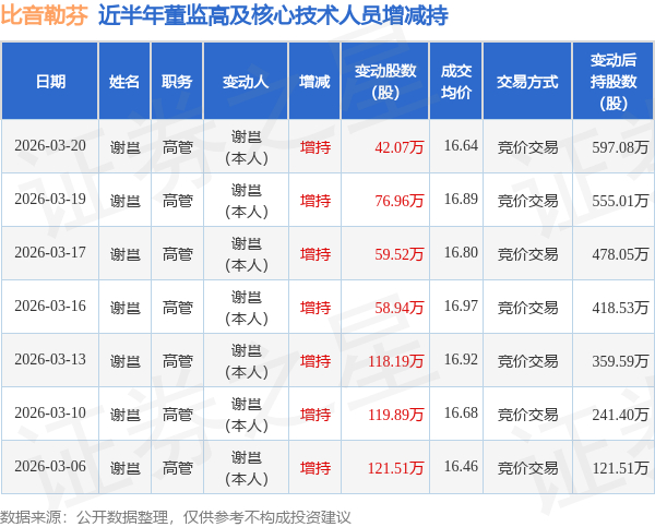 证券之星消息,根据3月23日市场公开信息、上市公司公告及交易所披露数据整理,比音勒芬(002832)最新董监高及相关人员股份变动情况:2026年3月20日公司高管谢邕共增持公司股份42.07万股,占公司总股本为0.0737%。变动期间公司股价下跌1.6%,3月20日当日收盘报16.62元。