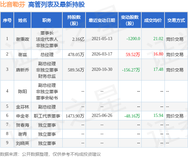 比音勒芬的高管列表及最新持股情况如下: