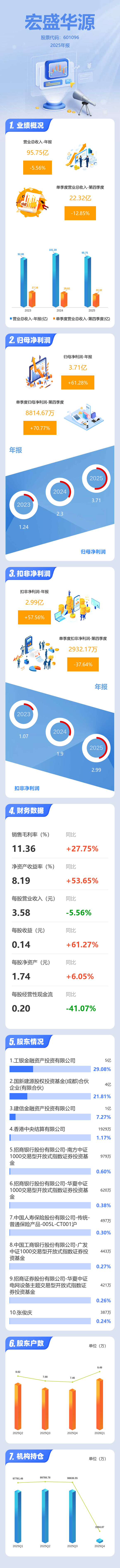 证券之星消息,宏盛华源2025年年报显示,当年度公司主营收入95.75亿元,同比下降5.56%;归母净利润3.71亿元,同比上升61.28%;扣非净利润2.99亿元,同比上升57.57%;其中2025年第四季度,公司单季度主营收入22.32亿元,同比下降12.85%;单季度归母净利润8814.67万元,同比上升70.77%;单季度扣非净利润2932.17万元,同比下降37.65%;负债率52.44%,投资收益522.32万元,财务费用738.39万元,毛利率11.36%。