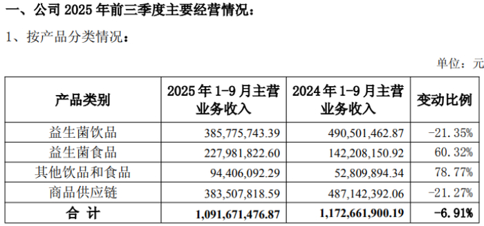 该业务收入从2020年的7.7亿元缩减至2023年的5.8亿元,各年同比降幅依次达35.16%、2.09%、13.65%和10.88%。至2024年,公司在财报中将其归入新设的“益生菌饮品”类别,而该品类收入仍未能扭转跌势,同比下滑2.71%。