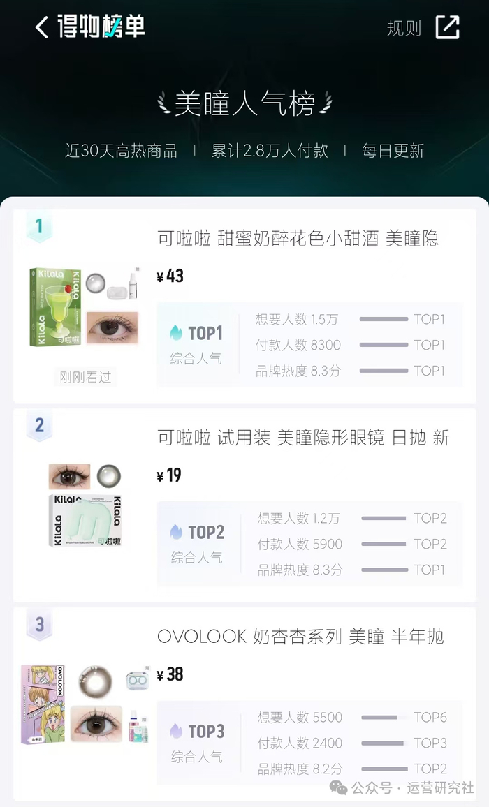 可啦啦几乎“霸占”了得物美瞳人气榜