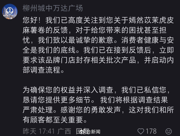 “消费者健康与安全是我们的底线。”柳州城中万达广场表示,已在接到反馈后,立即要求该品牌门店封存相关批次产品,并启动内部调查流程。
