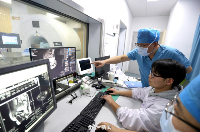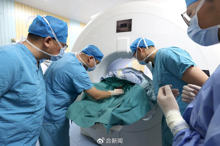 术前,泌尿外科、医学工程处、日间手术室及磁共振精准微创治疗中心多次沟通研讨,细化手术流程,做好充分准备。手术当日,在肖峻的指导下,医护团队通过磁共振扫描精准定位病灶。局部麻醉生效后,泌尿外科主治医师王常明将兼容磁共振的特殊穿刺针缓慢推进,通过反复扫描调整角度与深度,确保针尖准确命中目标。