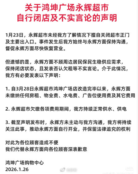 针对超市方面的这份通知,1月26日下午,鸿坤广场购物中心在社交平台发布了一份《关于鸿坤广场永辉超市自行闭店及不实言论的声明。