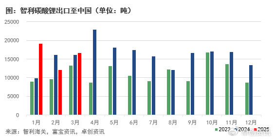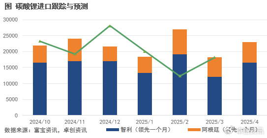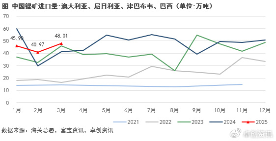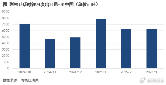 2. 海外资源增量冲击,进口量维持高位海外资源加速涌入国内市场,进一步加剧供给宽松预期。数据显示,3月智利出口至中国的碳酸锂达1.66万吨,环比增长37.8%;3月阿根廷碳酸锂总出口0.84万吨,环比增长4.3%,同比增长93.4%,其中出口至中国0.63万吨,环比增长2%,同比增长67%。阿根廷碳酸锂出口量同比激增,近两个季度对中月度出口量基本维持在5000吨以上,且4月初阿根廷矿业公司协会(CAEM)表示,阿根廷预计2025年将锂产量提升75%,将生产130800吨LCE,预计南美盐湖在年内仍能有一定产能释放提速。