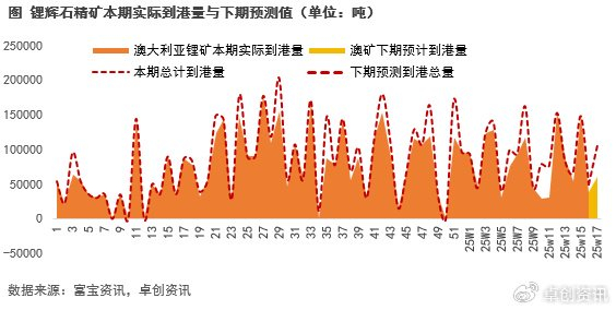 3. 成本支撑弱化,矿价下行拖累锂盐估值上游锂矿价格持续走弱,进一步削弱碳酸锂成本支撑。富宝资讯数据显示,4月中下旬锂辉石(澳矿SC6 CIF)报价跌至800美元/吨附近,较3月初高点回落8%,据市场反馈,非洲矿成交价已下探至760美元/吨,澳矿价格或难获支撑,矿端价格与锂盐形成负反馈螺旋:锂盐跌价倒逼矿商让利,而矿价下跌又为锂盐打开下行空间。当前锂矿到港量较高,矿企议价能力削弱,成本端或难以为碳酸锂提供有效支撑。