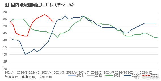 供给端:产能释放周期,出清进程缓慢1. 国内产量高位运行,短期扰动难改过剩格局据富宝资讯数据,截至4月17日当周,碳酸锂企业周度开工率53%,环比前一期下跌2个百分点,对应当周产量1.68万吨,环比前一期下跌2.33%,下降主因是部分锂盐厂停产以及产线检修。