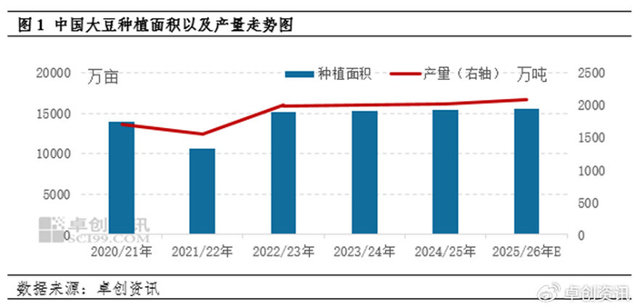2026年是“十五五”开局之年,作为开局之年的一号文件,开篇的首要任务指出要稳定发展粮油生产。对于大豆市场来说,文件指出要巩固提升大豆产能,做好产销衔接。卓创资讯数据显示,近五年度中国大豆面积及产量呈现震荡增加趋势,产量从2020/21年度的1697万吨增至2024/25年度的2020万吨,平均增长率7.47%。未来大豆产能的继续增加,在国内耕地面积较为紧张的背景下,单产的增加将是产量增加的主要方向。文件提及,推进粮油作物大面积提单产,推动粮食品种培优和品质提升。以东北产区为例,今年高蛋白优质品种增多,高油、低蛋白品种面积产量增加,主要品种包括绥农76、88,蛋白在44%左右。
