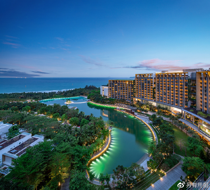 在酒店的中心地带,是一个面积达20000平方米的艾迪逊的人造海洋,水,乃活力与平静之源,这也是整个艾迪逊酒店的景观核心,一湾人造海洋,延伸到海边,很合理的把酒店的水景和海棠湾的大海连接起来,成为了一个整体。人造海洋的里的水就是从海棠湾引入的海水,这里为住店客人提供水上自行车、皮划艇等水上运动体验,这个设计挺妙的。