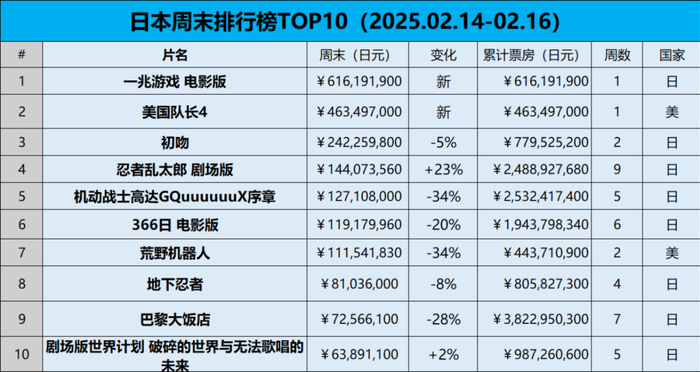 日本市场上周迎来两部实力不错的新片,市场排映格局再次重新洗牌,市场热度也有明显反弹。据统计,周末票房排名前十作品累计票房报20.4亿日元,较此前一周大涨50%。日剧剧场版《一兆游戏》开画周末斩获超6亿日元的成绩,空降周末票房榜冠军。美漫续集大片《美国队长4》首周也开出4.6亿日元以上的成绩,屈居周末票房亚军。本土奇幻爱情片《初吻》次周末进账超2.4亿日元,走势极为出色,退居周末票房季军。本土《忍者乱太郎 剧场版》周末再收1.44亿日元,回升至周末榜第四位。另一部动画作品《机动战士高达GQuuuuuuX序章》周末再收1.27亿日元的票房成绩,仍位列周末票房前五名。