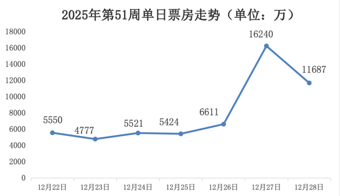 上周(12月22日至12月28日)是2025年第51周,根据已有数据的1.25余万家影院,247.5万放映场次计,本周全国票房报5.58亿,其中分账票房占5.05亿,大盘环比上周下跌25.7%,大盘比去年同一周(大盘6.21亿)低了一成。本周观影人次约1301万,环比下跌24.8%;本周平均票价42.9元,票价比前一周下跌0.5元;本周场均人次5.2人,环比上周下跌1.3人。