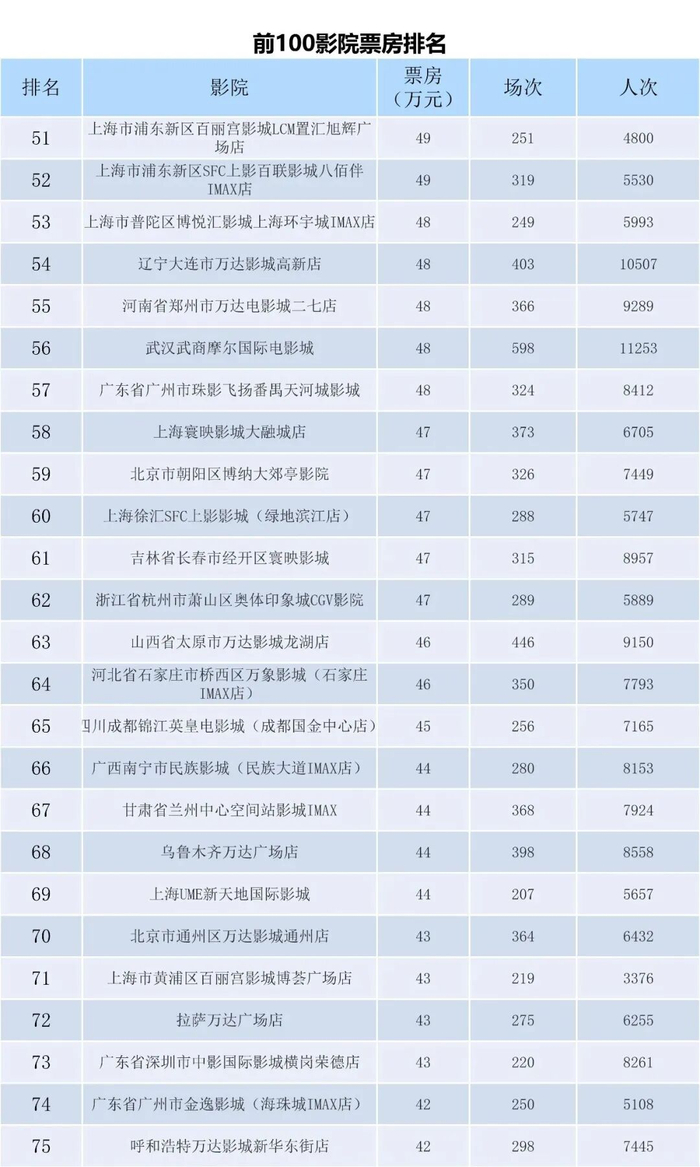影院方面,全国前十名的影院票房均突破75万元,前100名门槛线回落至38万元;上海市浦东新区MOViEMOViE影城前滩太古里店仍居全国榜首,单周进账115万元;上海市上海影城居全国亚军,单周收入票房111万元;广东省深圳市百老汇电影中心影城单周收入110万票房,位居全国票房季军;上海市杨浦区中影国际影城合生汇店本周进账90万,位列全国票房第四;贵州省贵阳市越界影城未来方舟店本周进账88万,升居全国榜第五。前十名影院中以一线影院为主,全国前十门槛线达79万,比此前一周下降10万;排映场次最高的影城是广东省深圳市CINESKY新天影院(壹方天地IMAX店),平均每天排映近90场。