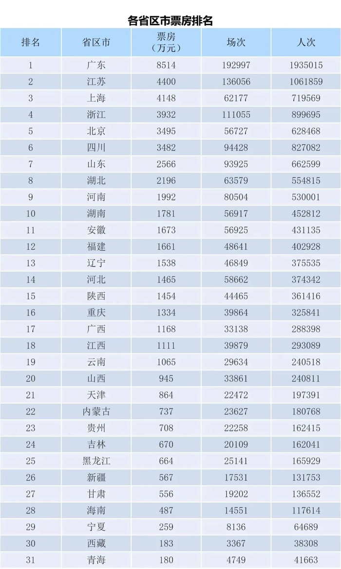 本周排在前五的省份依次是广东、江苏、上海、浙江和北京,上海跻身前三。广东省轻松蝉联冠军,单周斩获票房8514万元,环比上周下跌25%,单周观影人次达193.5万左右。江苏单周收获票房4400万元,较前一周下跌28.15%,观影人次约106.2万名。上海单周进账4148万元,超过浙江升居全国季军,观影人次达71.95万名。浙江本周产出票房3932万元,退居单周票房榜第四,观影人次达90万名左右。北京本周产出票房3494万元,升居全国榜第五,观影人次约为62.84万名。