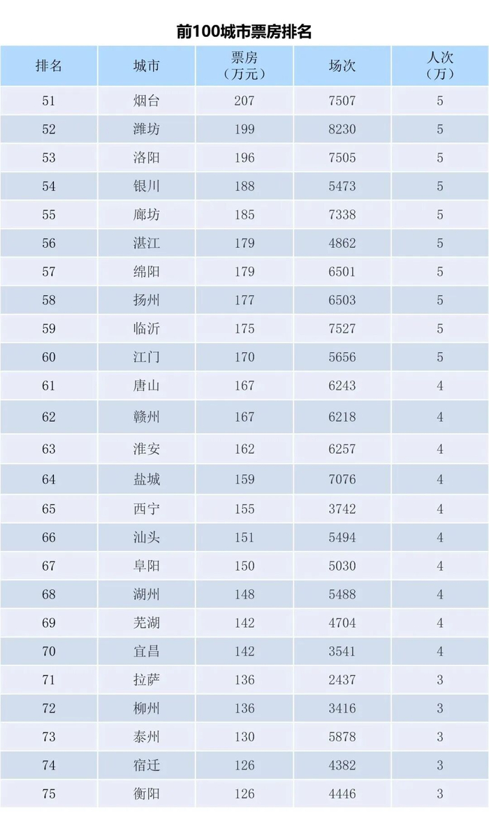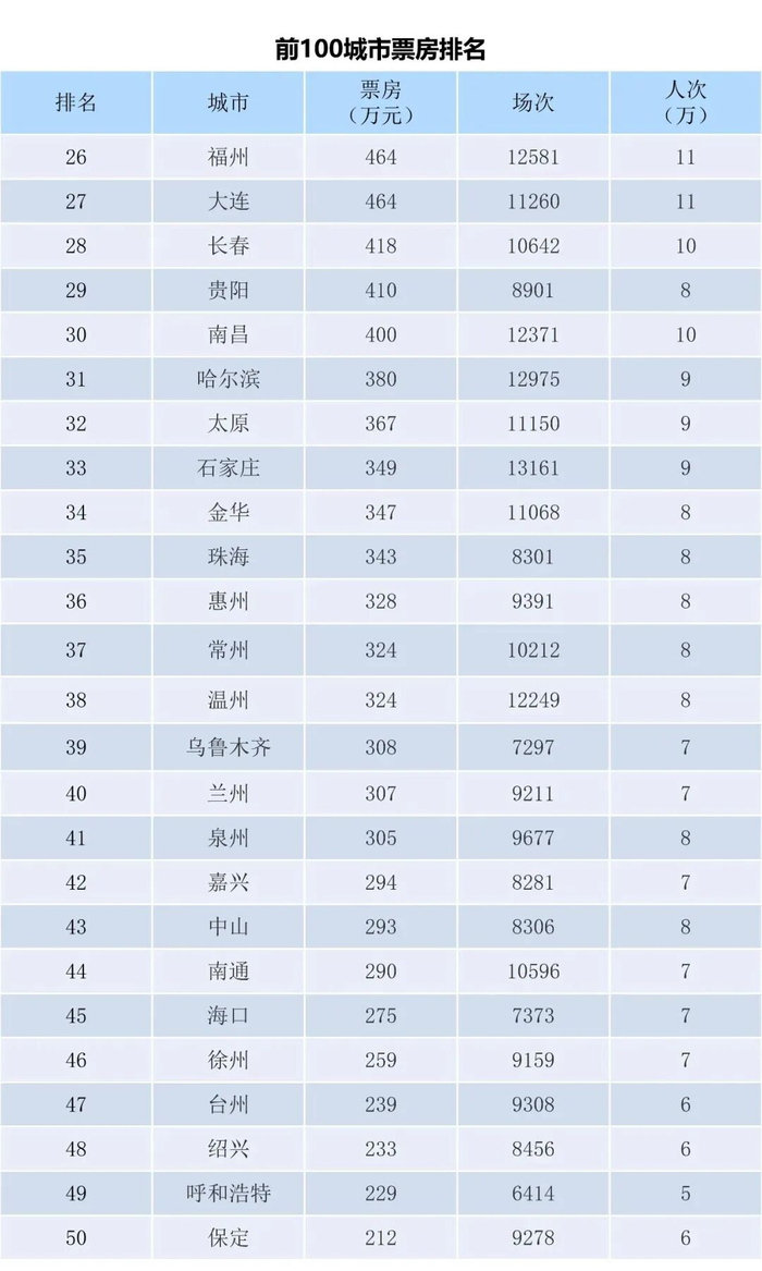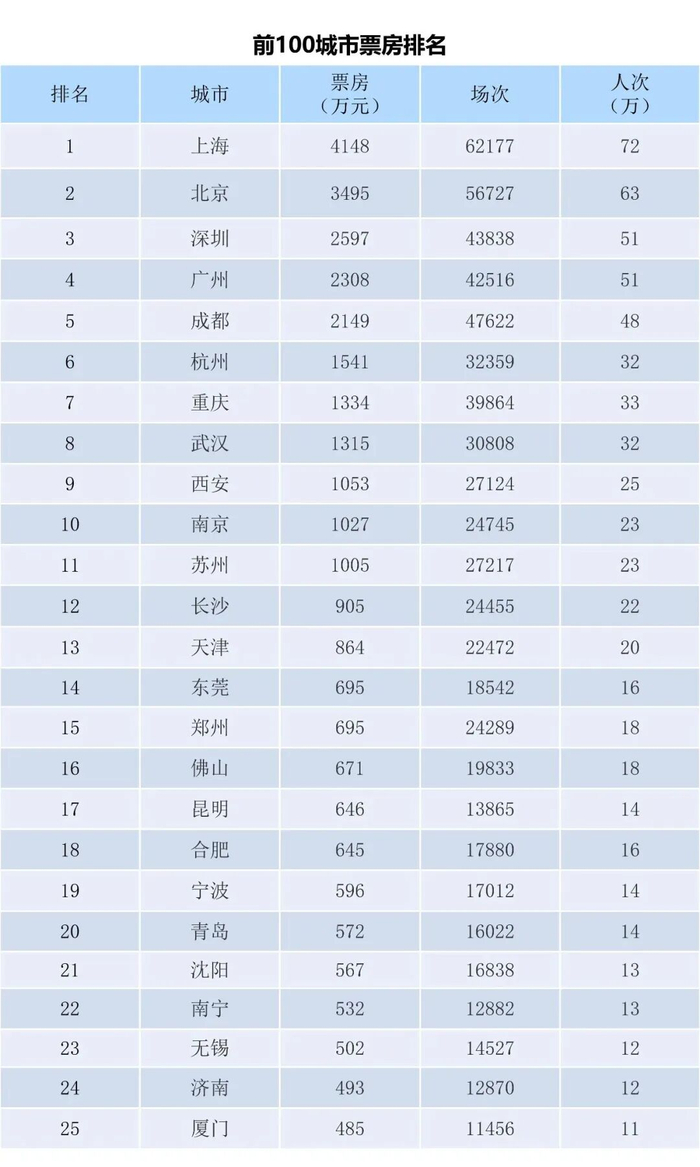 上周排在前五的城市分别是上海、北京、深圳、广州和成都,排名保持不变。上海、北京两市上周分别收入4148万和3495万,差距略有扩大。全国共有5个城市单周突破2000万,前十名城市门槛线回升至1000余万;前四大城市本周共收1.255亿,占全国总收入的22.1%,占比较前一周回升1个点。全国前十名城市共收入2.1亿,占全国总票房的37.5%,占比也比前一周回升1个点。本周全国十强门槛线为南京,单周产出票房1027万;全国票房前十城市中票价最高是上海市,单周票价仍超过57.5元。本周全国城市票房前100名门槛线是辽宁鞍山,单周产出票房99万元。