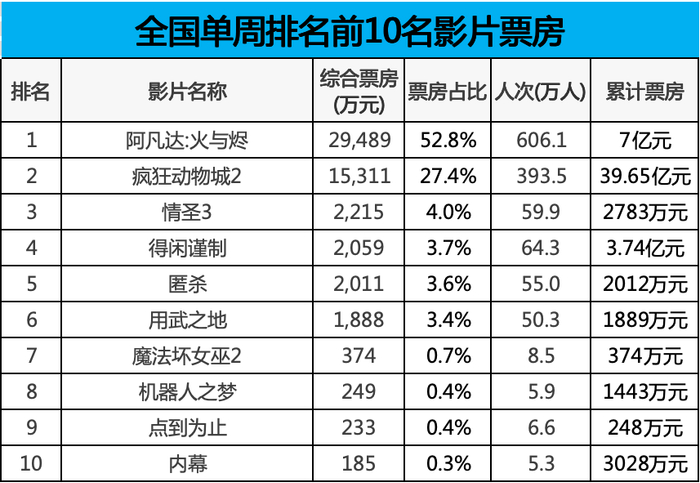 全国电影市场热度明显下滑,上周仍只有两部作品单周破亿,卫冕冠军《阿凡达3》次周再砍近3亿,而老片《疯狂动物城2》单周再破1.5亿,其余还有《情圣3》《得闲谨制》等片单周突破千万,而前十门槛线仍不到200万。上周票房前十名中共有3部进口片,进口片市场份额回落至81.5%。