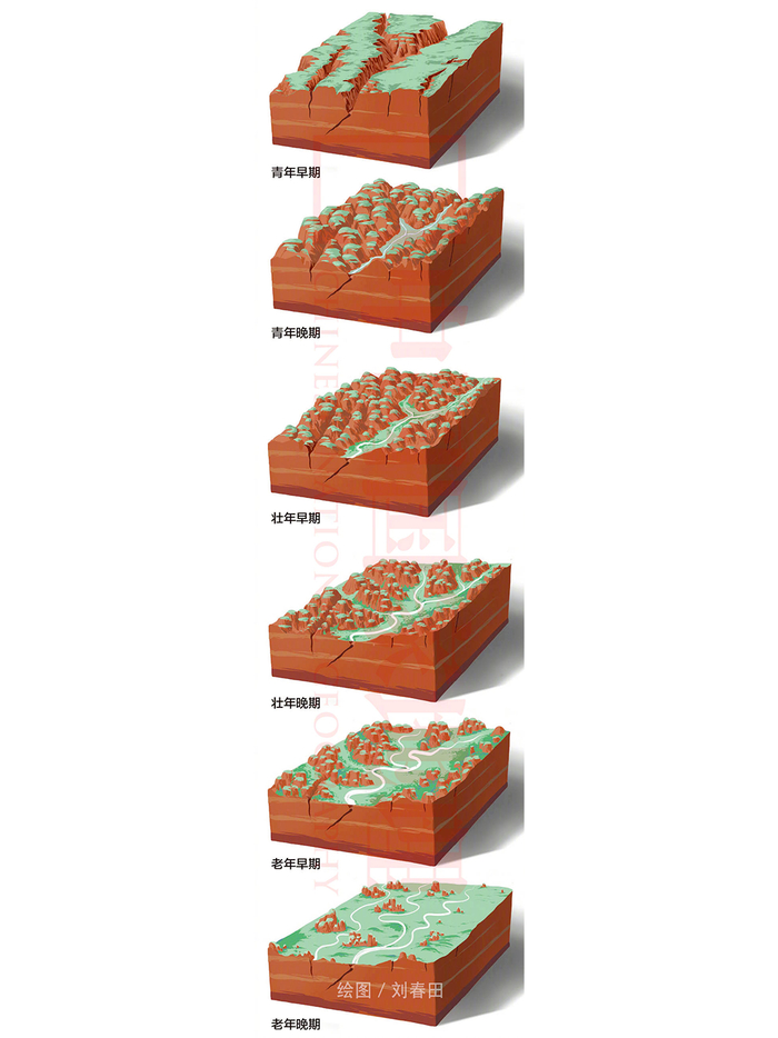 在此基础上,彭华教授将丹霞进一步划分为青年早期、青年晚期、壮年早期、壮年晚期、老年早期和老年晚期6个阶段,进一步完善了丹霞地貌演化模式。