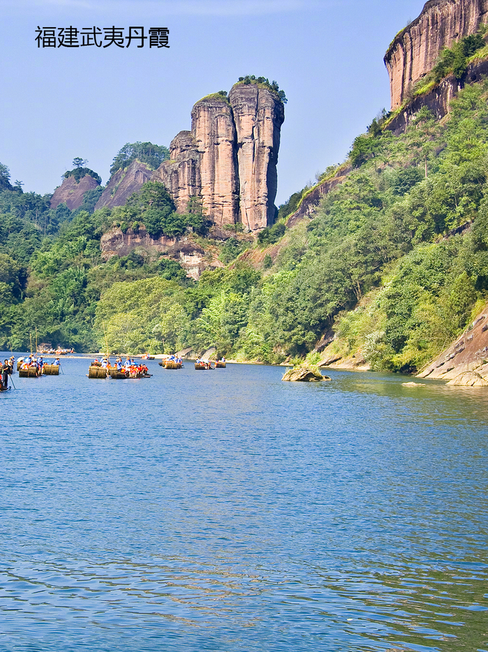 武夷山是由红色砂砾岩组成的低山丘陵,九曲溪两岸为典型的丹霞地貌,顶缓斜、壁陡峭,山峰峭拔。
