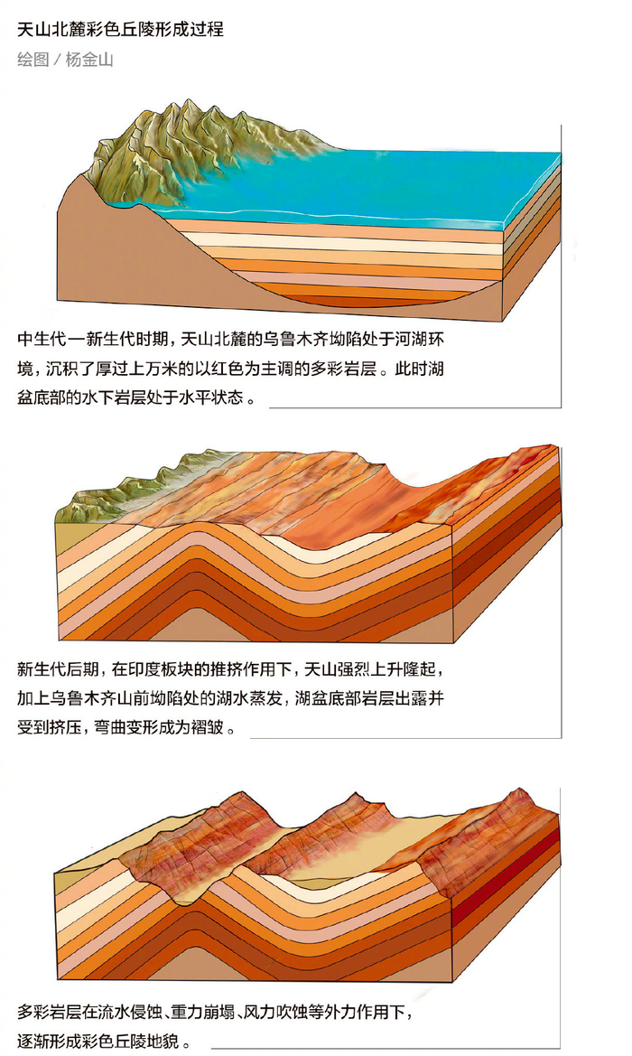 丹霞地貌的演化过程始于红层盆地的抬升,在流水、风化、重力等外动力作用下,沟谷不断展宽,崖壁崩塌后退,山顶面积不断缩小,原来的山体逐步退缩成“堡状残峰”或孤立石柱。