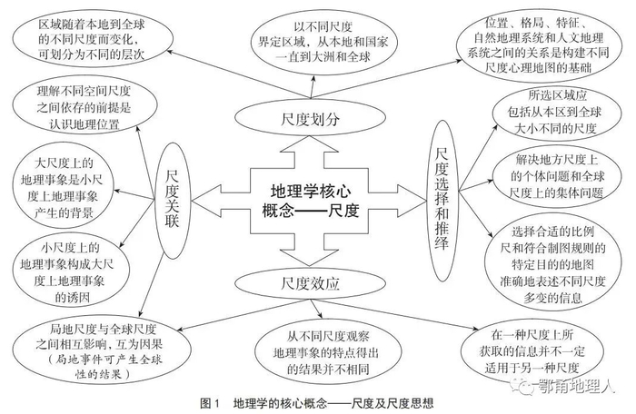 尺度思维是通过尺度的透镜观察和理解地理事象、分析和解决地理问题的观念, 包括尺度划分、尺度匹配、尺度关联、尺度效应、尺度选择和尺度推绎等思想内容(如图1) 。